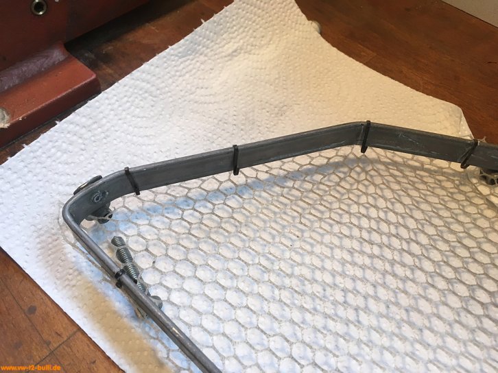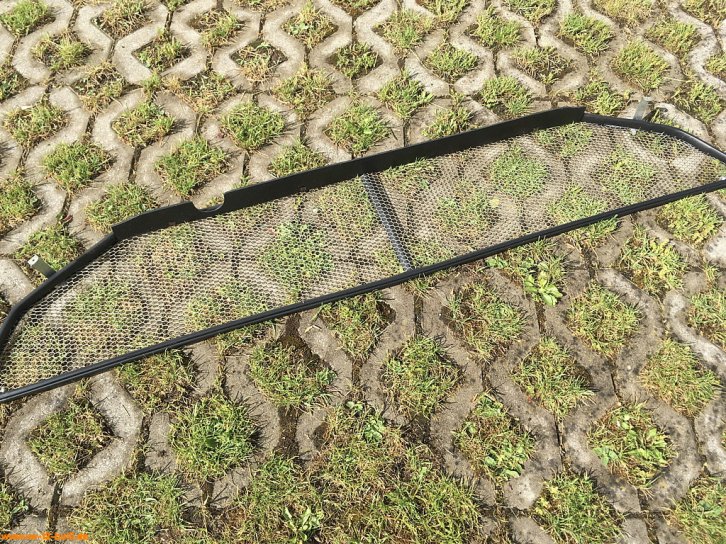 Das alte Polyester-Netztuch wurde langsam brüchig und hatte erste kleine Lücken. Nach Ersatz suchend bin ich bei Engel-Netze GmbH & Co. KG aus Bremerhaven fündig geworden. Dort fand ich das Material als "Netztuch, Polyester (PES), Maschengröße 8mm x 8mm, 173g/qm, 1,25m breit" mit 2m Länge (beim Karmann über die gesamte Breite) für um 15 €. Es ist nicht 100%ig identisch (es ist stärker rautenförmig statt sechseckig), aber noch ähnlich in Art und Dichte. Das DIN A4 Blatt im Bild sind Wasserschieber mit auch türkisen "KAMEI Safety" Aufkleber die ich mir mal gemacht hatte anhand von KAMEI Katalog Signets