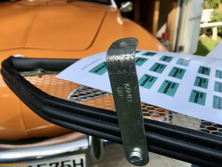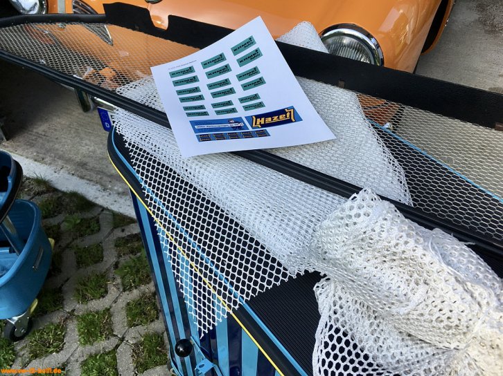 Das alte Polyester-Netztuch wurde langsam brüchig und hatte erste kleine Lücken. Nach Ersatz suchend bin ich bei Engel-Netze GmbH & Co. KG aus Bremerhaven fündig geworden. Dort fand ich das Material als "Netztuch, Polyester (PES), Maschengröße 8mm x 8mm, 173g/qm, 1,25m breit" mit 2m Länge (beim Karmann über die gesamte Breite) für um 15 €. Es ist nicht 100%ig identisch (es ist stärker rautenförmig statt sechseckig), aber noch ähnlich in Art und Dichte. Das DIN A4 Blatt im Bild sind Wasserschieber mit auch türkisen "KAMEI Safety" Aufkleber die ich mir mal gemacht hatte anhand von KAMEI Katalog Signets